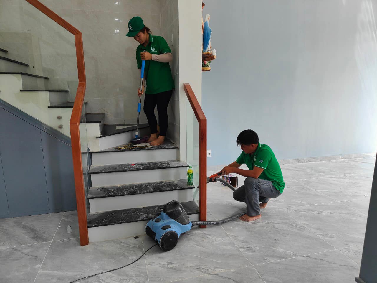 Mô tả: Lau chùi và dọn dẹp cầu thang, bao gồm lau chùi bậc thang, cánh cửa, tay vịn và các bề mặt khác để giữ cho cầu thang luôn sạch sẽ và an toàn.